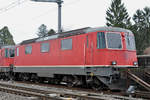 Doppeltraktion, mit den BLS Loks 465 012-3 und 465 007-3, durchfahren den Bahnhof Pratteln. Die Aufnahme stammt vom 14.02.2018.