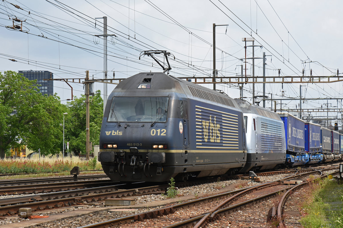 Doppeltraktion, mit den BLS Loks 465 012-3 und 465 016-4, durchfahren den Bahnhof Pratteln. Die Aufnahme stammt vom 06.06.2018.