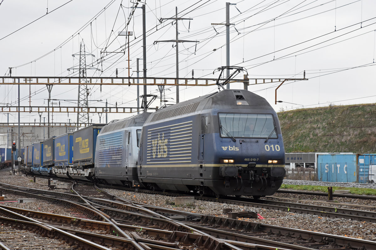 Doppeltraktion, mit den BLS Loks 465 010-7 und 465 016-4 durchfährt den Bahnhof Pratteln. Die Aufnahme stammt vom 06.03.2019.