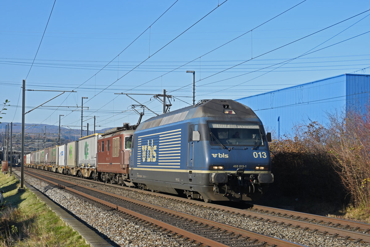 Doppeltraktion, mit den BLS Loks 465 013-1 und 425 190 fährt Richtung Bahnhof Itingen. Die Aufnahme stammt vom 03.12.2019.
