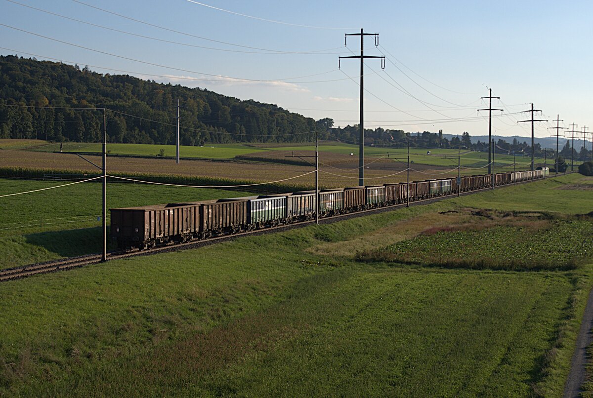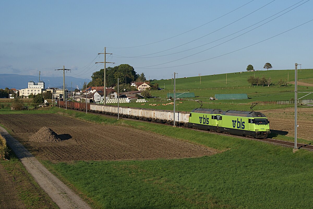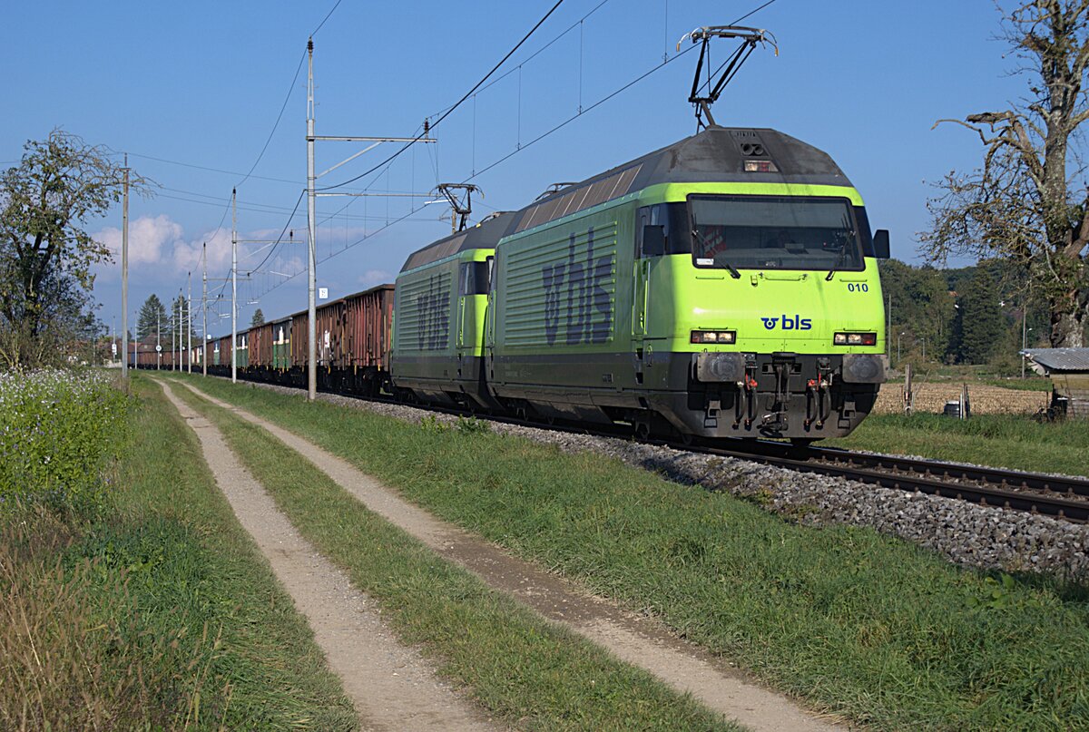 Auch bei starkem Regen, trübem Wetter und mit grünem Anstrich machen die BLS Re 465 eine gute Figur. Das grüne Duo mit der 01 an der Spitze dieses Zuges auf der Fahrt in Richtung Norden anlässlich der Bahnhofsdurchfahrt Burgdorf am 3. Februar 2021.