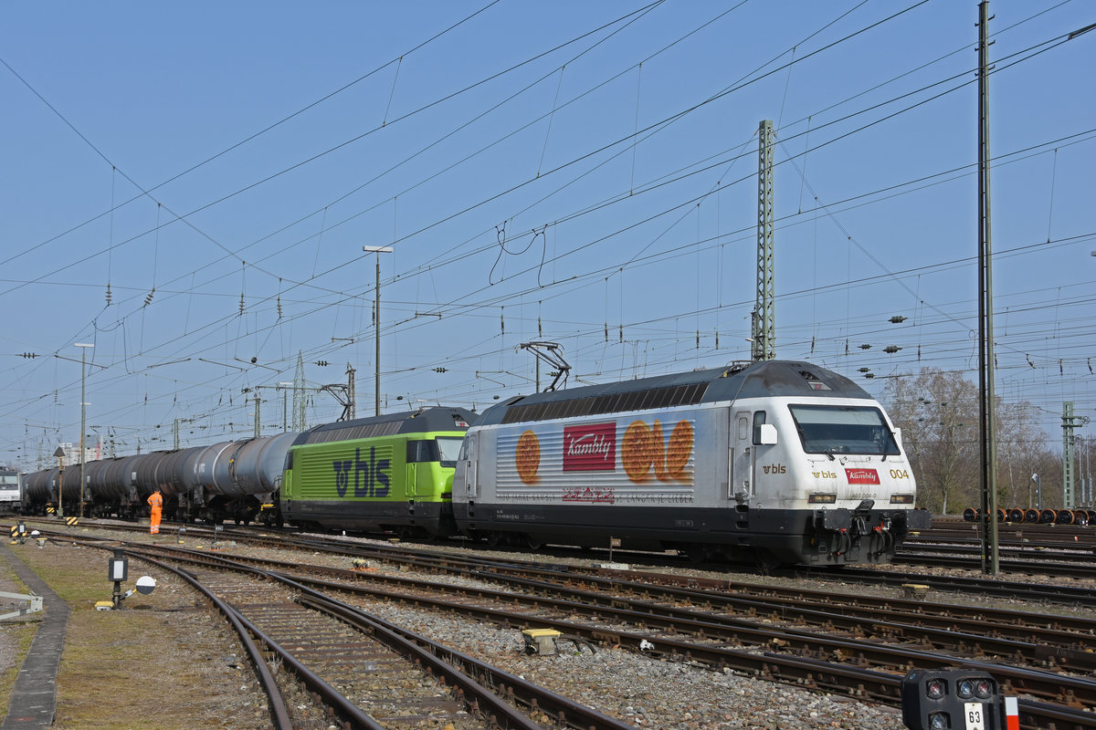 Doppeltraktion, mit den BLS Loks 465 004-0 und 465 015-6 durchfährt den badischen Bahnhof. Die Aufnahme stammt vom 24.02.2021.