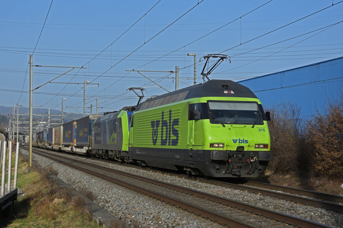 Doppeltraktion, mit den BLS Loks 465 015-6 und 485 003-8 fährt Richtung Bahnhof Itingen. Die Aufnahme stammt vom 26.02.2021.