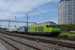 Re 465 005-7 der BLS durchfährt den Bahnhof Pratteln.