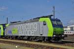 Die Re 465 009 mit einem Interfacewagen und den ABst 184  Shania Train  und dem Bst 381  Montreux  am 27.2.26 beim Bahnhof Spiez.