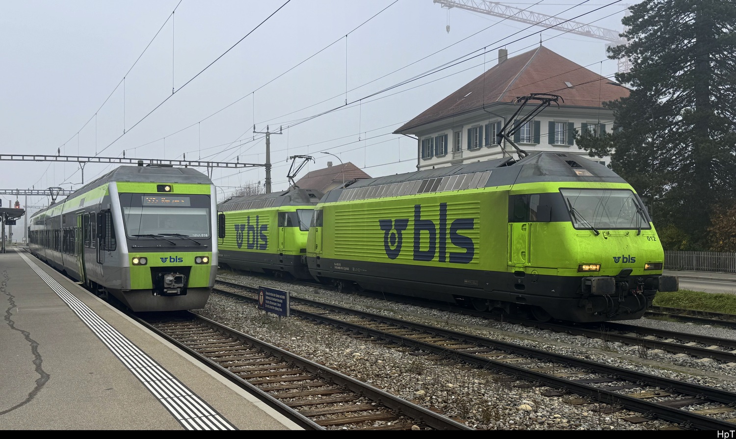 BLS - Loks 465 001 + 465 010 bei Rangierfahrt im Bhf. Lyss am 11.11.2025