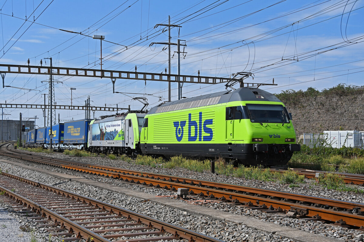 Doppeltraktion, mit den BLS Loks 465 007-3 und 486 509-3 durchfährt am 12.09.2023 den Bahnhof Pratteln.