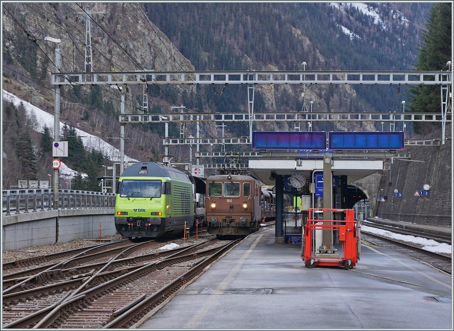In Goppenstein verlässt die BLS Re 4/4 184 mit ihrem AT1 Autotunnelzug nach Kandersteg den Bahnhof während aus Kandersteg die hier nicht zu sehende BLS Re 465 017 an der Zugsspitze und die Re 465 002 mit ihrem AT1 Autotunnelzug Goppenstein erreichen.