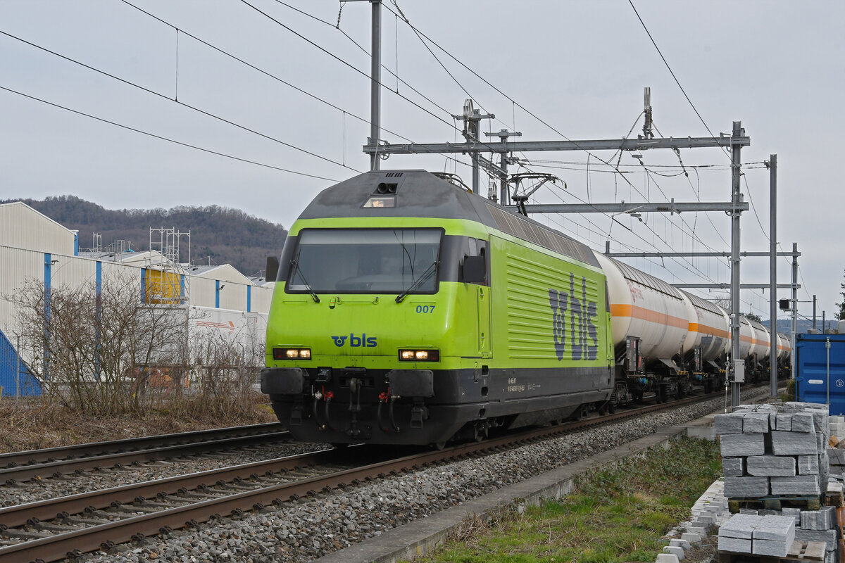 Re 465 007-3 der BLS fährt am 26.02.2024 Richtung Bahnhof Lausen.