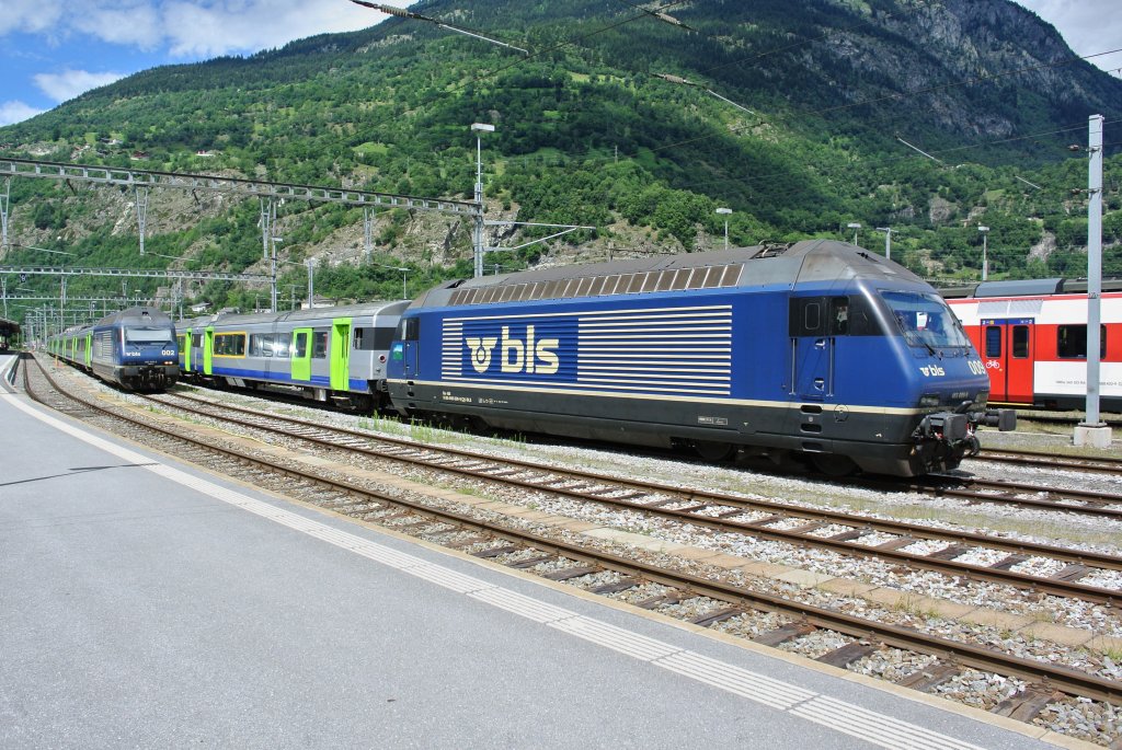 Die beiden BLS Zusatz-RE warten in Brig, bis sie am Abend via Lötschbergbergstrecke zurück nach Bern fahren. Bei den Pendeln handelt es sich um 6-teilige EWIII Pendel (ex. SBB Swiss Express). Links ist die Re 465 002 (RE 3549), rechts die Re 465 009 (RE 3545), 14.07.2012.