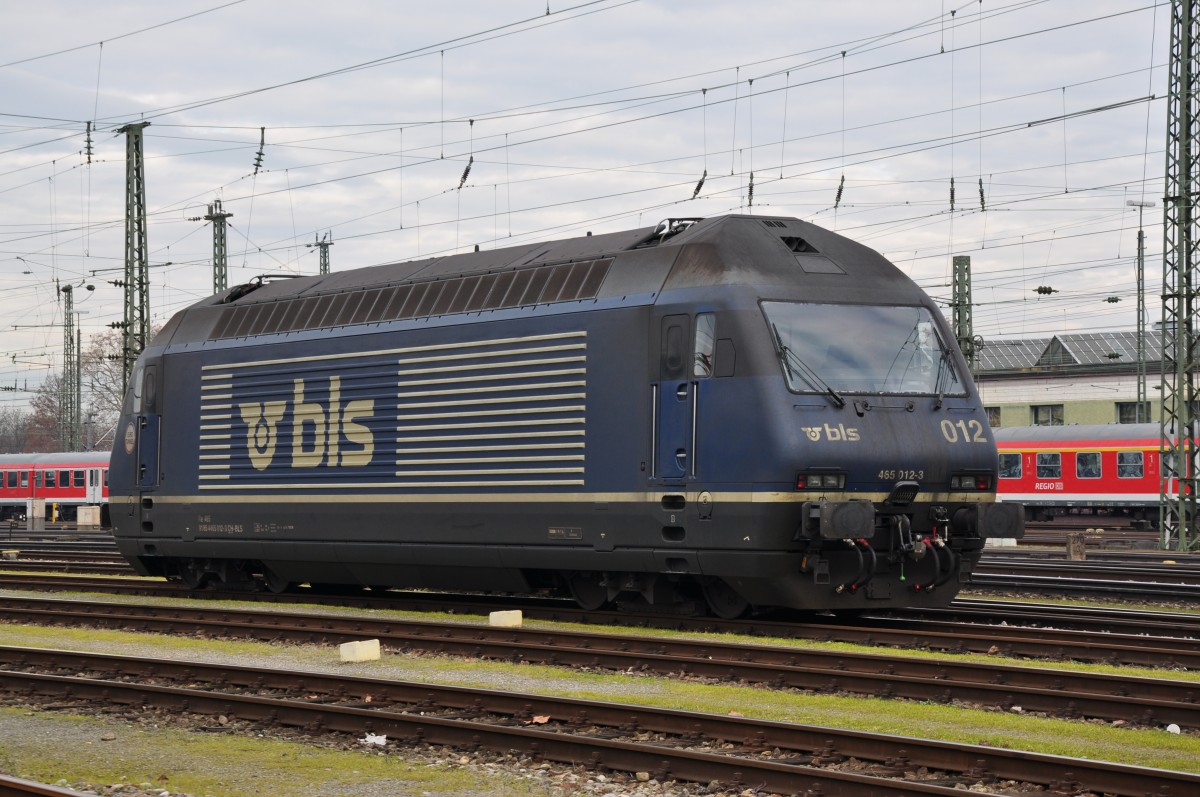 BLS Re 465 012-3 auf einem Abstellgleis beim Badischen Bahnhof in Basel. Die Aufnahme stammt vom 18.12.2013.