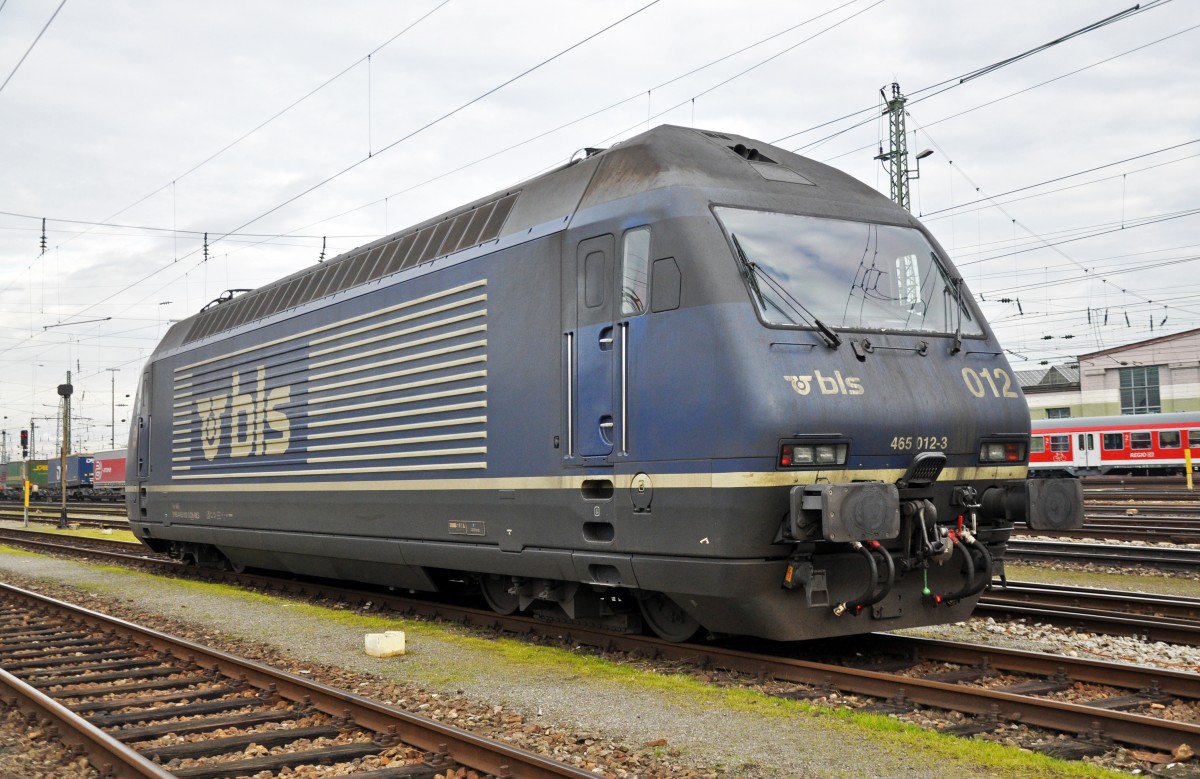 BLS Re 465 012-3 auf einem Abstellgleis beim Badischen Bahnhof in Basel.