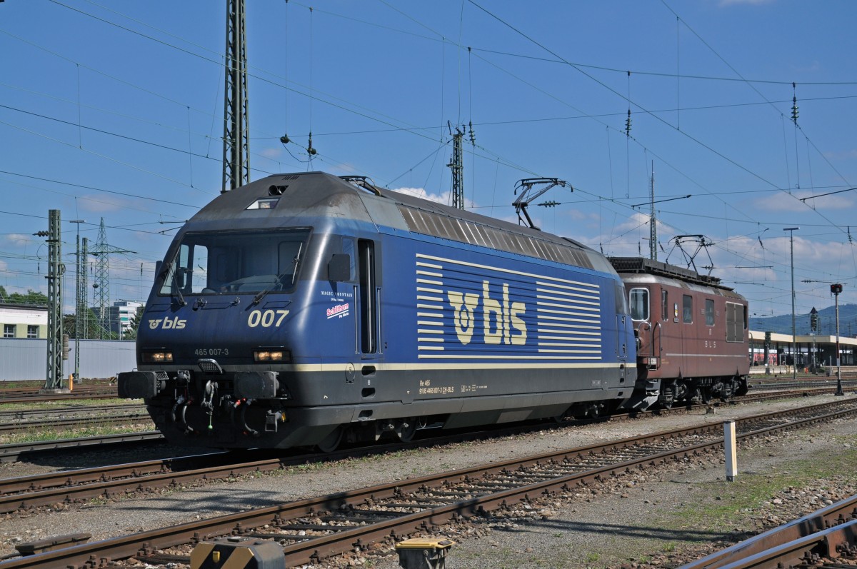 Re 465 007-3 zusammen mit der Re 425 171 am Badischen Bahnhof. Die Aufnahme stammt vom 15.07.2014.