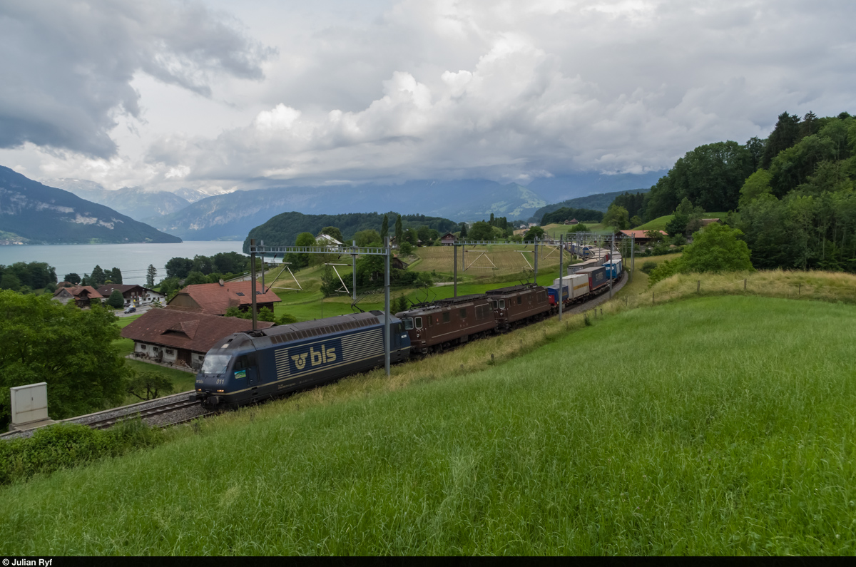 Ein Güterzug von BLS Cargo bespannt mit Re 465 011 sowie zwei Re 4/4 kreuzt am 14. Juni 2015 bei Kumm am Thunersee nordwärts fahrend einen Crossrail Güterzug. Die Loks verkehren trotz des relativ grossen Altersunterschiedes (ca. 30 Jahre) in Vielfachsteuerung.