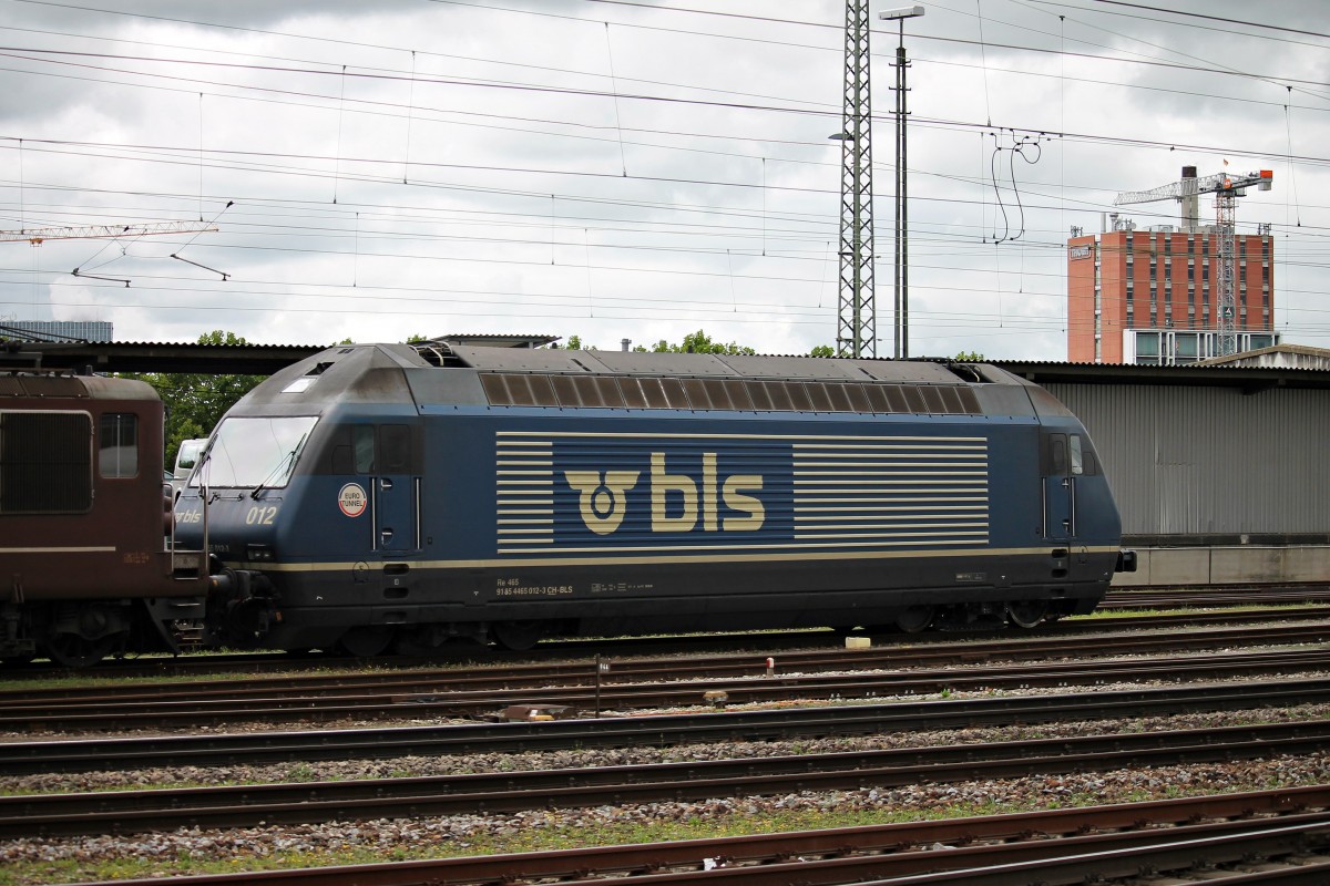 Am 29.07.2014 stand BLS Cargo Re 465 012-3 "Euro Tunnel" abgestellt auf einem angemieteten Abstellgleis von BLS Cargo in Basel Bad Bf.