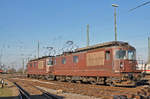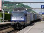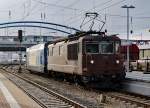 Vierfach Traktion mit den BLS Loks 182, 465 014-9, 465 002-4 und 174 durchfahren den Badischen Bahnhof.