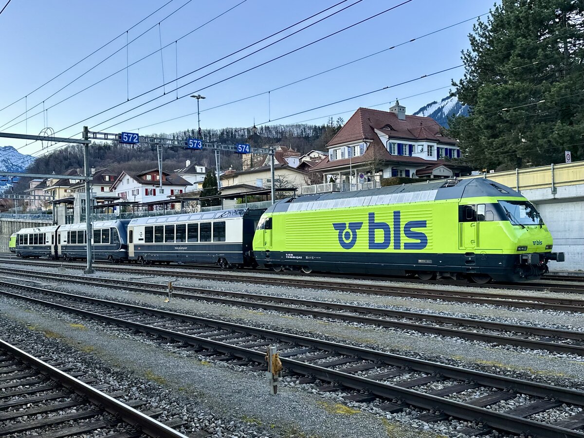Zwei BLS Re 465 ziehen (bzw. bremsen) bei Lalden einen langen Transitgüterzug Südwärts.