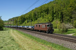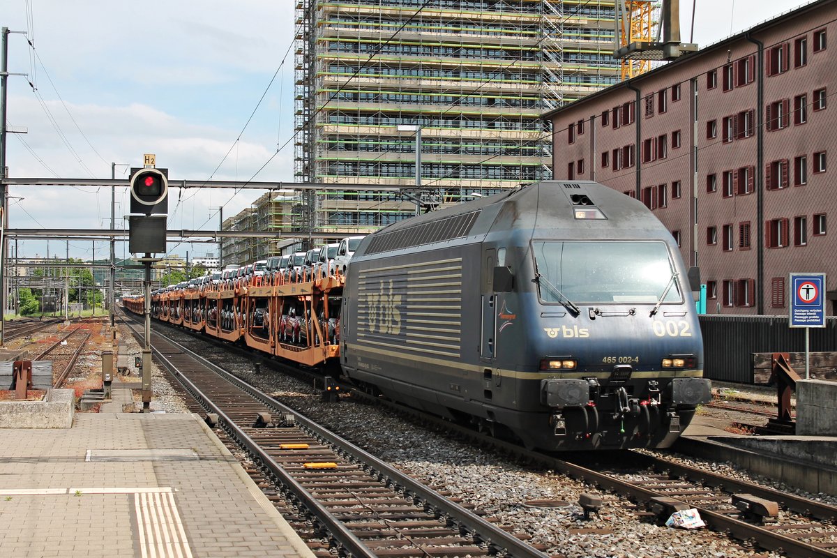 Re 465 002-4 "Gornergrat" am 14.05.2015 bei der Durchfahrt mit einem Autozug nach Lahr (Schwarzw) aus Richtung Olten gen Weil am Rhein in Pratteln.