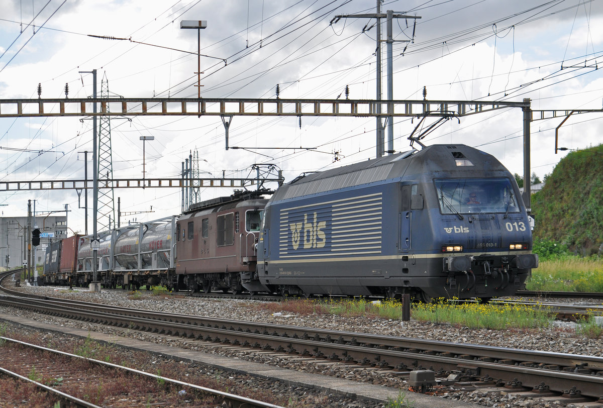 Doppeltraktion, mit den BLS Loks 465 013-1 und 425 172, durchfahren den Bahnhof Pratteln. Die Aufnahme stammt vom 17.06.2016.