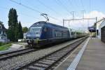 BLS Lok Re 465 002-4 durchfährt den Bahnhof Pratteln. Das abzweigende Gleis führt auf eine Strasse und in ein Industriegebiet, von wo aus auch diese Aufnahme am 03.08.2016 entstand.