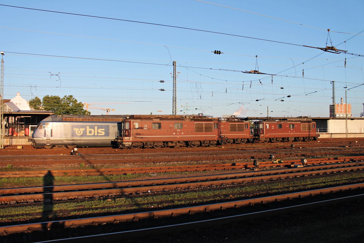 Am 24.06.2015 standen Re 465 014-9 "Spalenberg", Re 4/4 174 (425 174) "Frutigen", eine unbekannt gebliebene Re 4/4 und Re 4/4 186 (425 186) "Leissigen" zusammen in den ersten Sonnetrahlen im Abstellbereich von BLS Cargo in Basel Bad Bf abgestellt und warten auf ihren nächsten Einsatz.