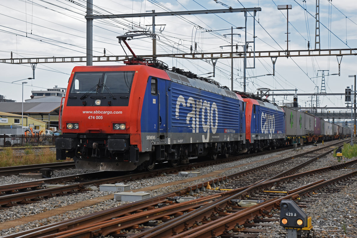 Doppeltraktion, mit den Loks 474 005-6 und 474 017-1, durchfährt den Bahnhof Pratteln. Die Aufnahme stammt vom 12.08.2020.
