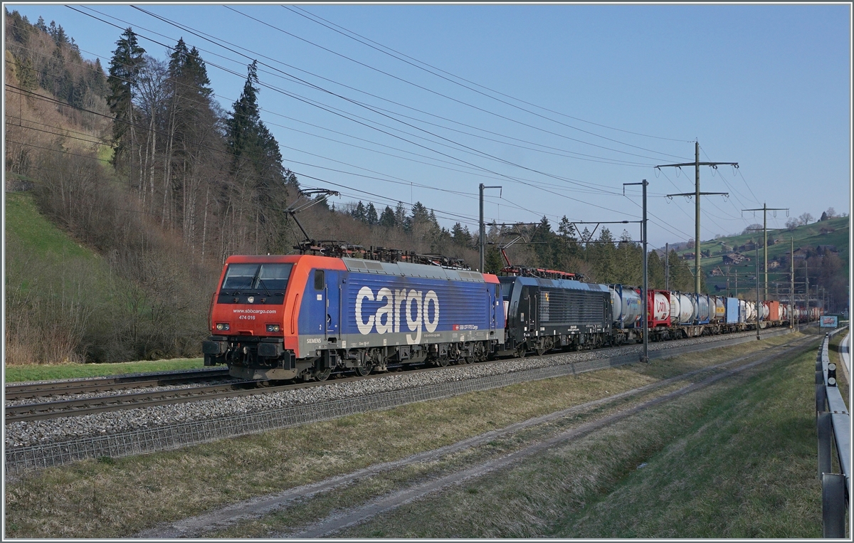 Die SBB Re 474 016 und eine weitere Lok dieses Typs sind bei Mülenen mit einem Güterzug Richtung Süden unterwegs.
