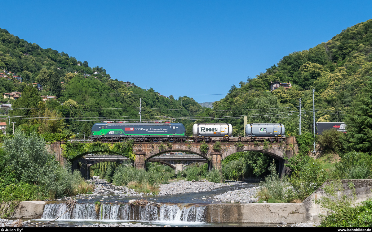 Die SBB Re 474 009 fährt mit einem Güterzug in Richtung Luino durch den Bahnhof von San Nazzaro.