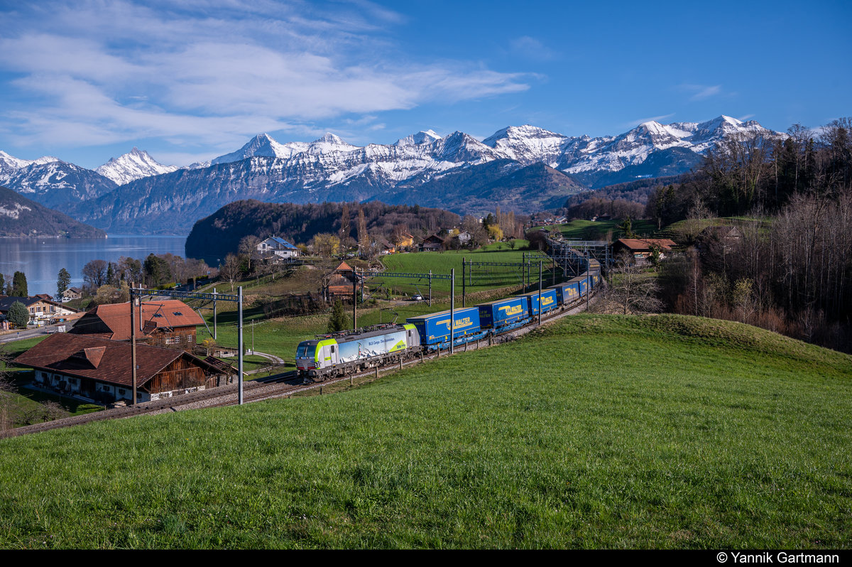 BLS Cargo Re 475 410 mit einem LKW Walter Ganzzug am 15.03.2020 bei Spiez