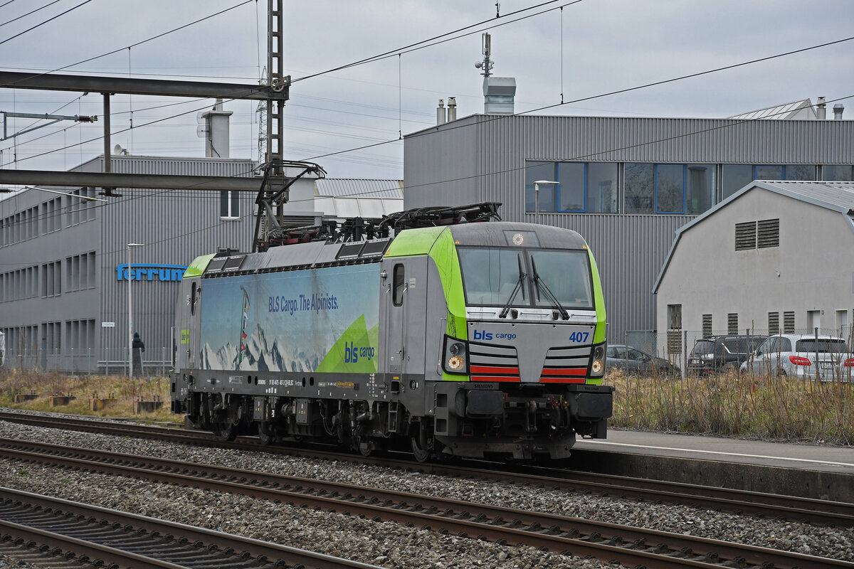 Siemens Vectron 475 407-3 der BLS durchfährt am 27.02.2023 solo den Bahnhof Rupperswil.