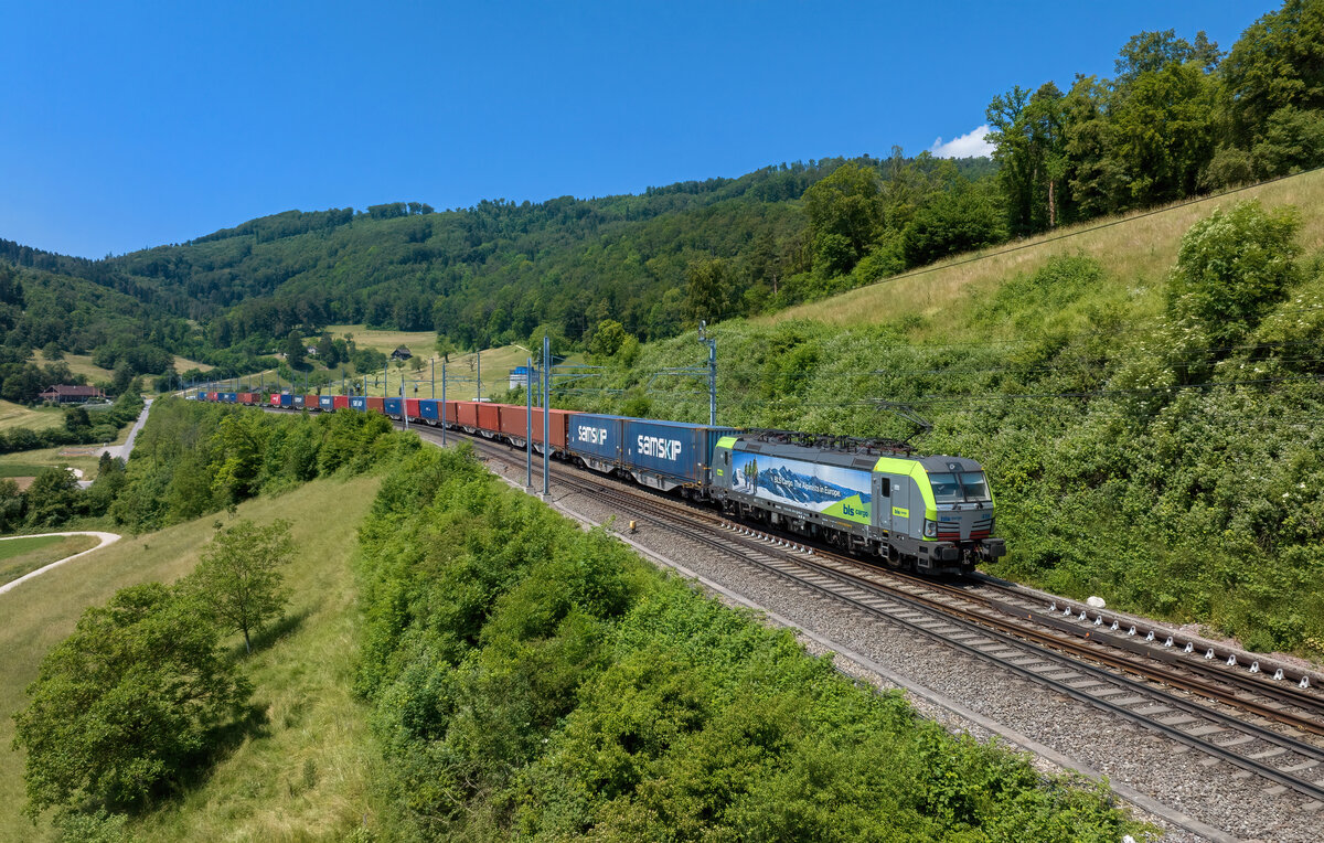 Re 475 419 mit einem Containerzug am 07.06.2023 bei Schinznach Dorf.