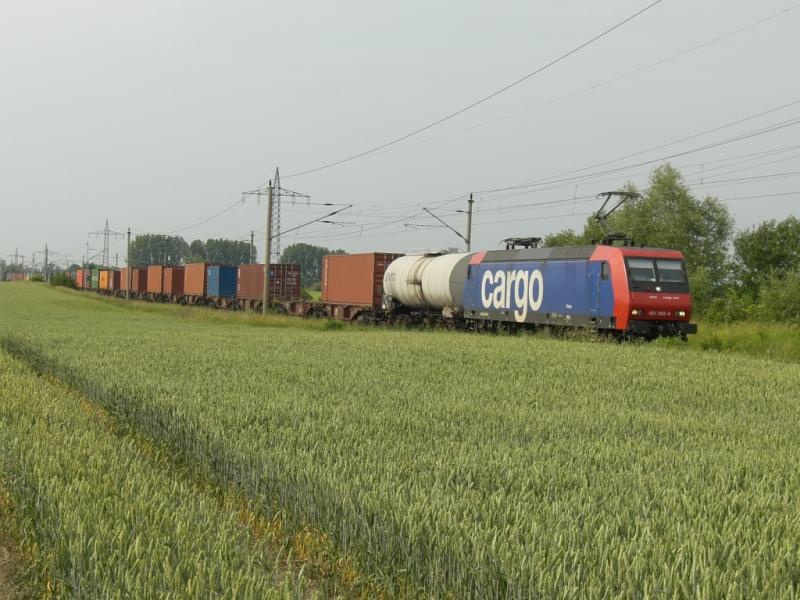 481 002 der SBB Cargo GmbH erreicht kurz vor Satzkorn den Bahnübergang mit ihrem Güterzug.