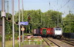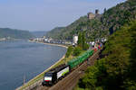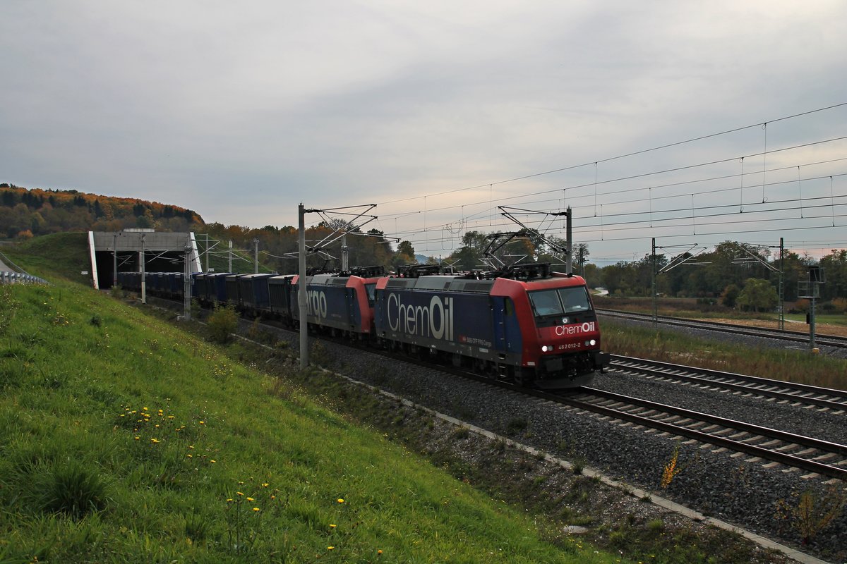 Mit einem leeren Stahlzug "Containerzug" fuhr am 24.10.2015 die Re 482 012-2 "ChemOil" zusammen mit Re 482 004-9 aus dem Katzenbergtunnel in Richtung Norden.