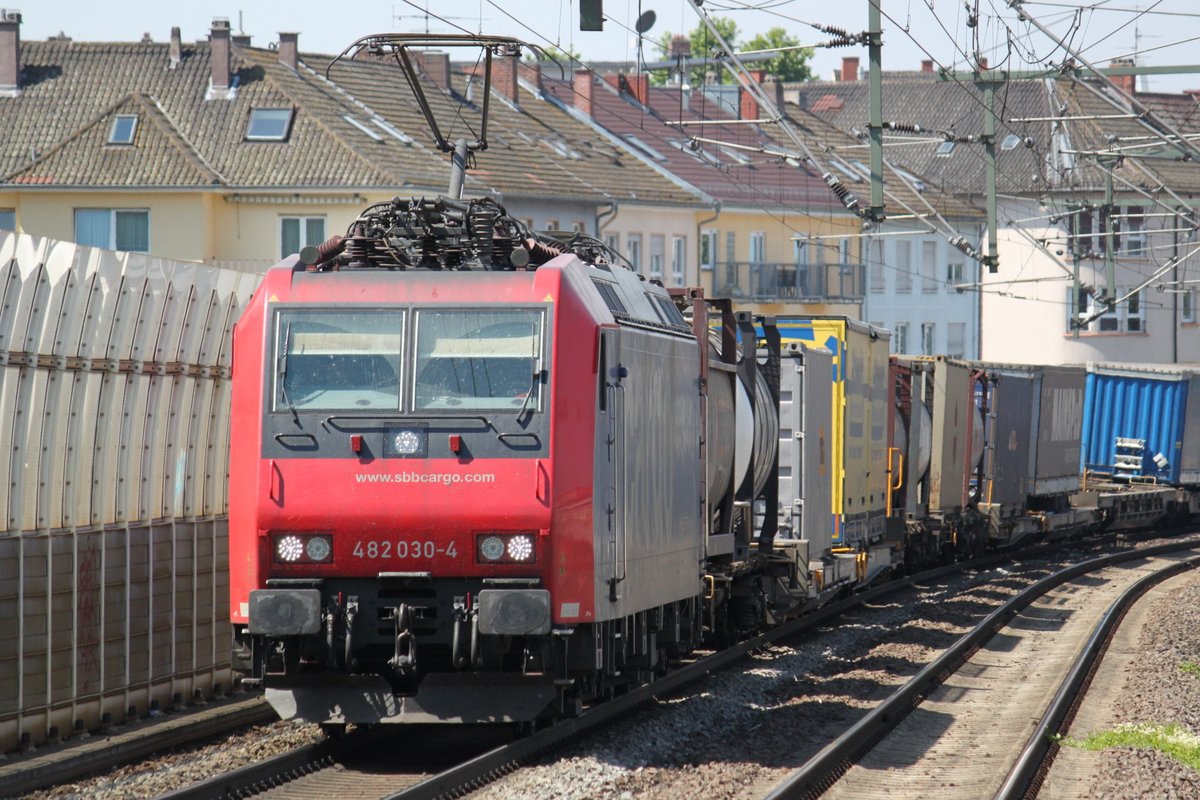 482 030 von SBB Cargo ist am 14.06.2017 mit einem KLV-Zug in Richtung Schweiz unterwegs. Hier in Ludwigshafen Mitte.