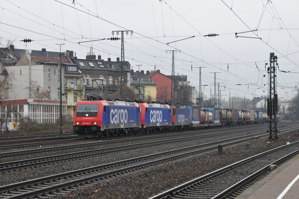 482 043-7 mit Schwesterlok sowie der abgebügelten 421 377-3 erreichen Köln-West, und müssen über eine Stunde auf dem Nebengleis auf die Weiterfahrt warten. Aufgenommen am 11/12/2010.