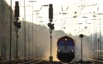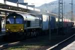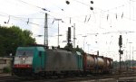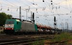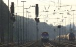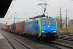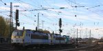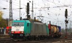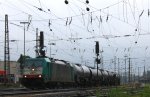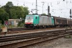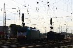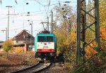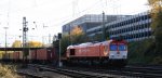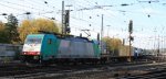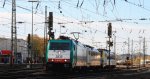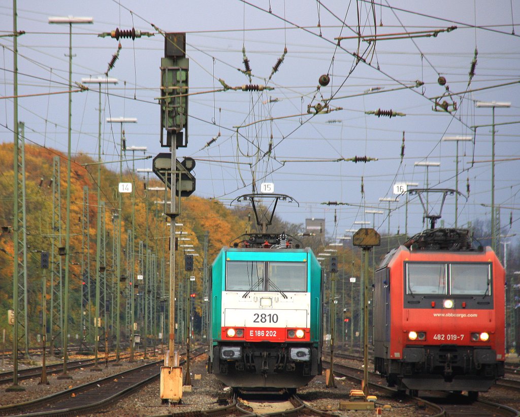 Die Cobra 2810 steht mit einem Containerzug und wartet auf die Abfahrt nach Antwerpen-Oorderen(B) und auf dem Nebengleis rangiet die 482 019-7 von der SBB Cargo in Aachen-West bei Regenwolken am 10.11.2012.