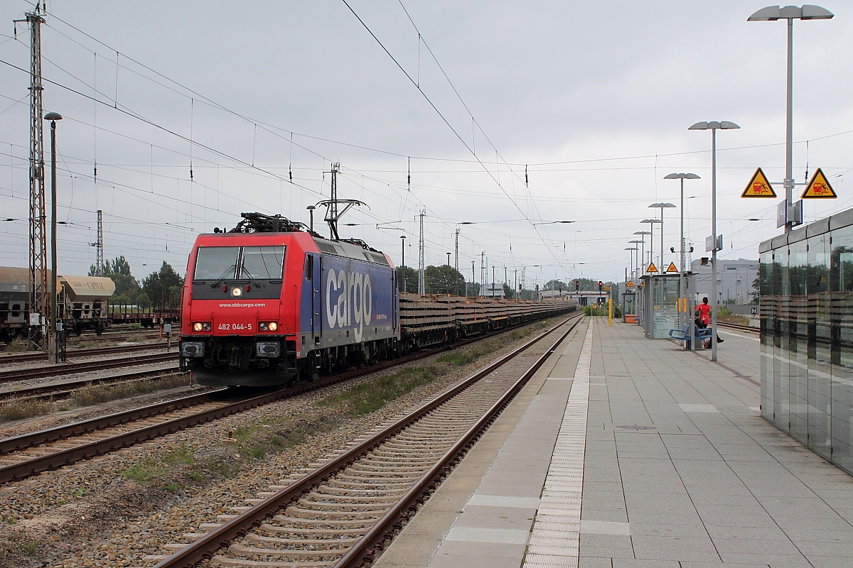 Die 482 044-5 der SBB Cargo mit einem Altschwellenzug am 01.09.2014 bei der Durchfahrt in Oranienburg.