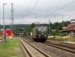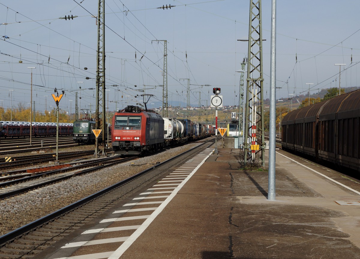 SRI/SBB: Ein Güterzug von SBB Cargo International mit der 482 019-7 anlässlich einer seltenen Begegnung mit der SRT 151 124-5 (ehemals DB) in Weil am Rhein am 31. Oktober 2015.