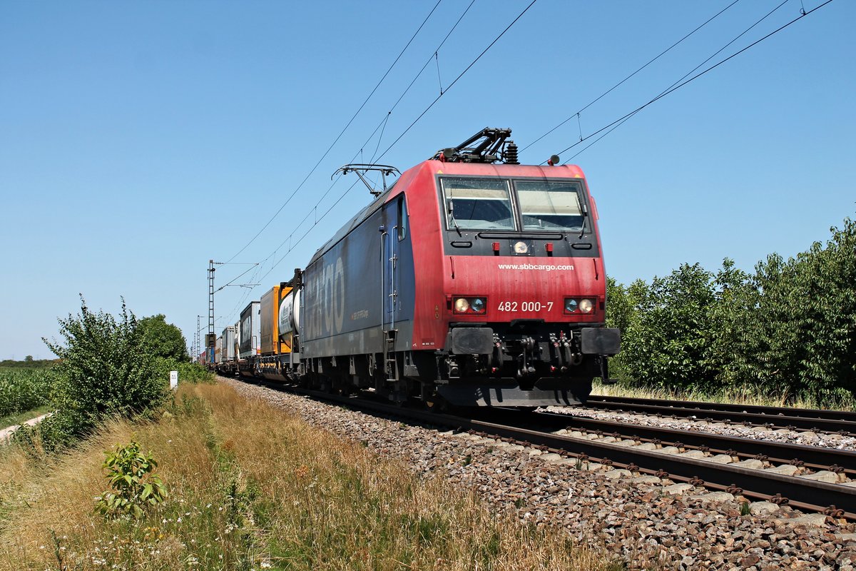Am Mittag des 10.07.2015 fuhr Re 482 000-7 "Köln" mit einem Containerzug bei Hügelheim auf der KBS 703 in Richtung Schweizer Grenze, als sie den Fotografen passierte.