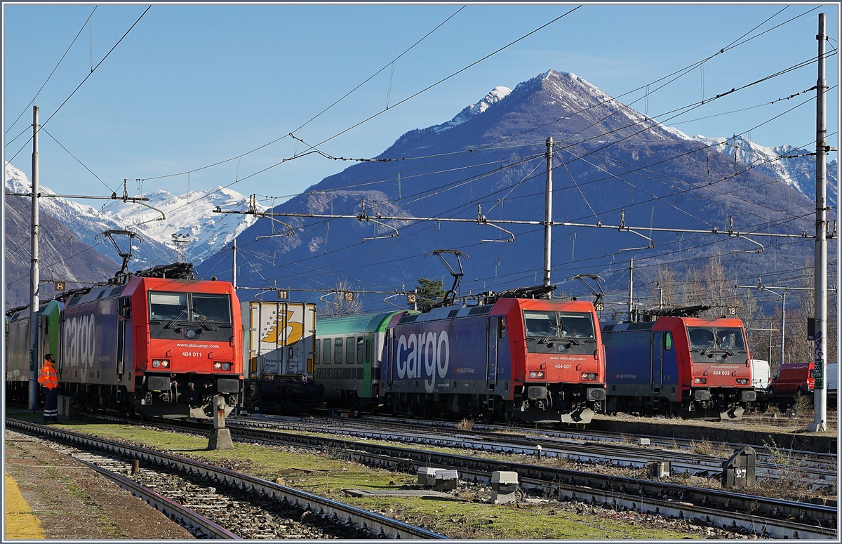 v.l.n.r: Re 484 011 wird die BLS Re 485 von der RoLa in den Wechselstromteil verschieben, die Re 484 007 verlässt mir einer Rola Domodossola und die Re 484 003 erreichte als Lokfahrt den Grenzbahnhof.