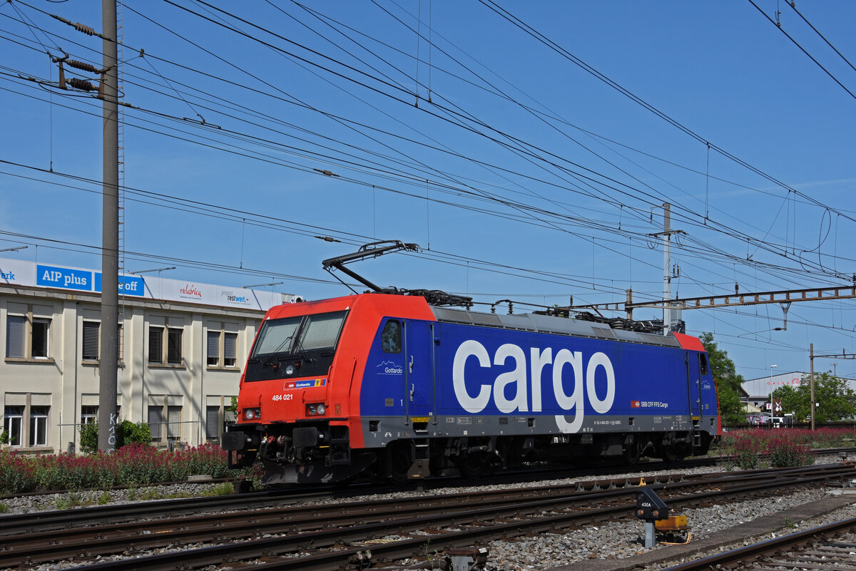 Re 484 021-1 durchfährt solo den Bahnhof Pratteln. Die Aufnahme stammt vom 20.05.2022.