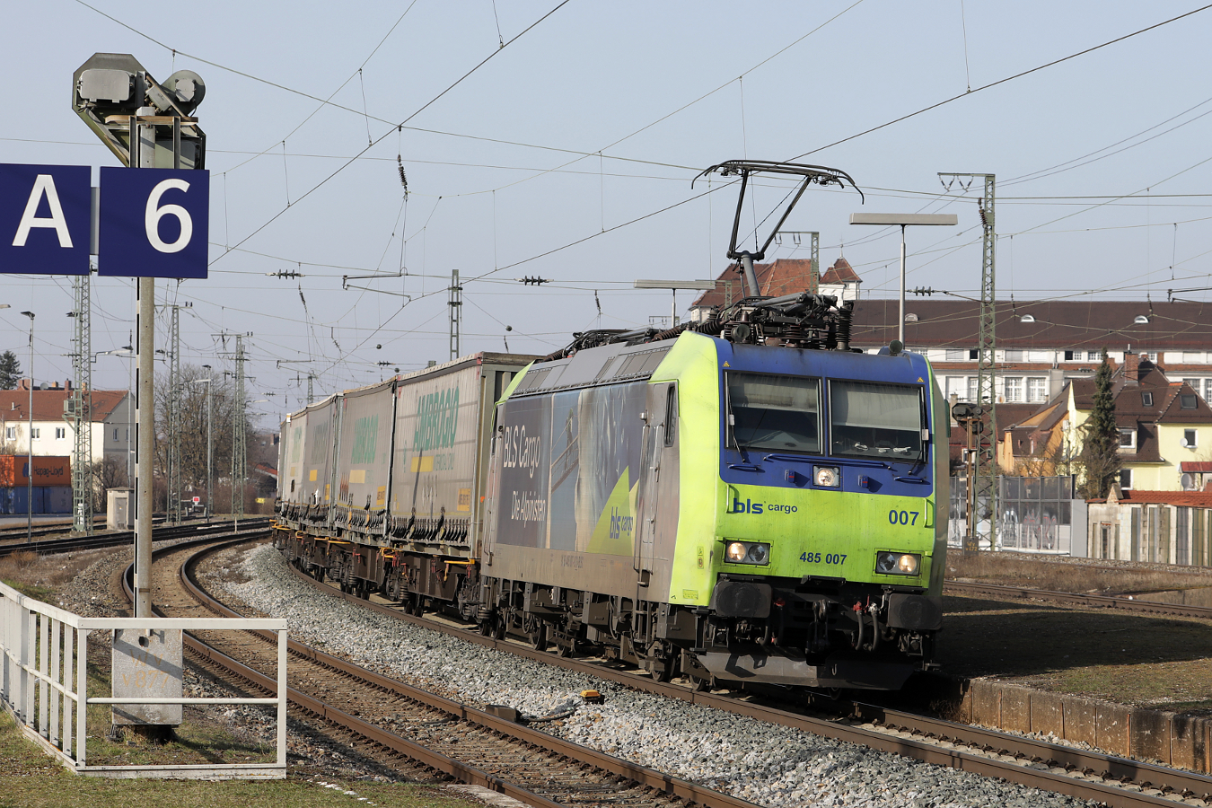 Re 485 006-1 der BLS durchfährt am 09.03.2026 den Bahnhof Pratteln.