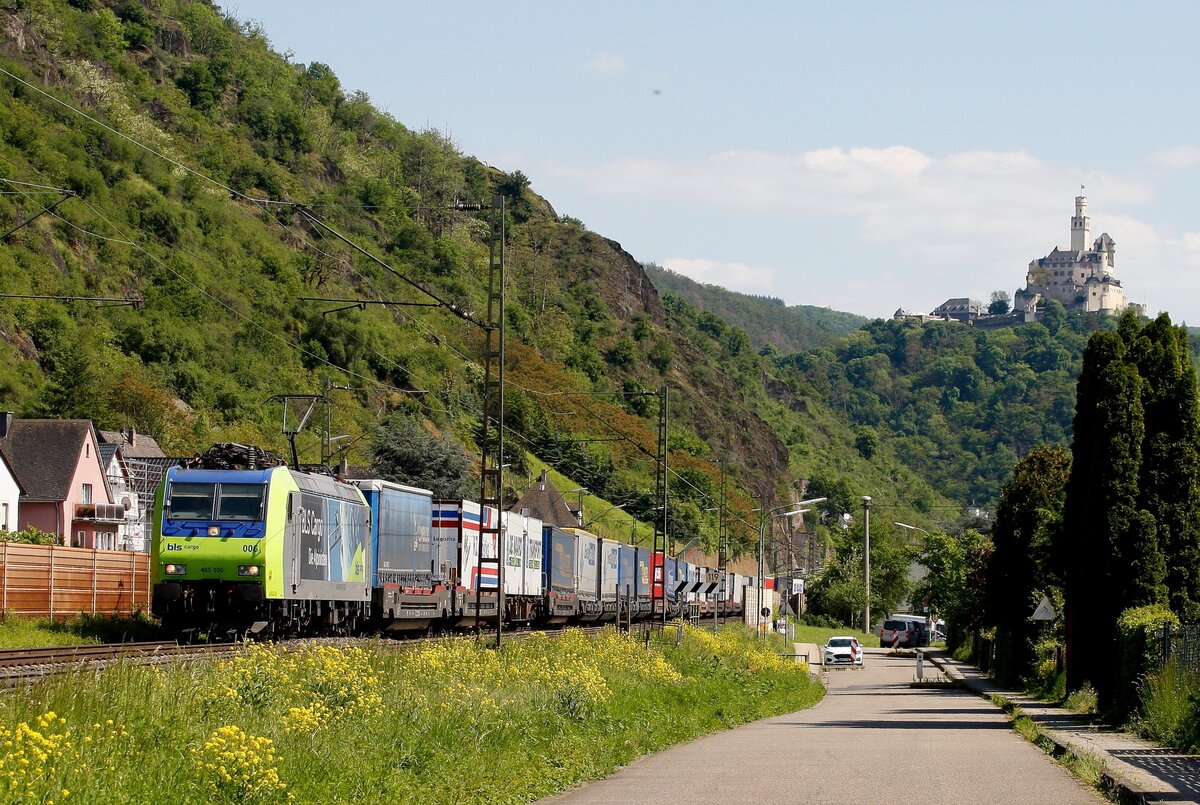 BLS 485 006 in der Nähe von Braubach auf der rechten Rheinseite am 11.05.2024