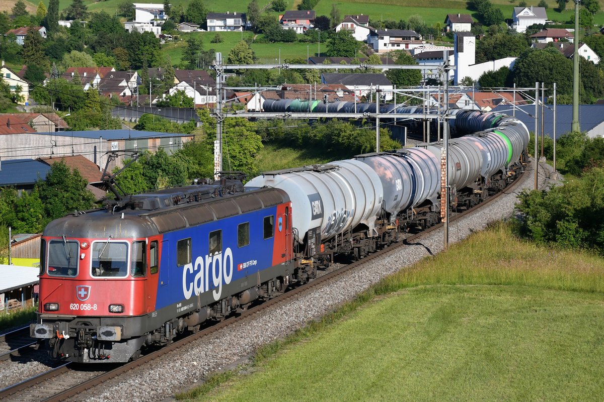 Re 620 058-8  Auvernier  mit einem Kesselzug unterwegs nach Basel, aufgenommen am Abend des 25.06.2020 bei Zeihen AG.