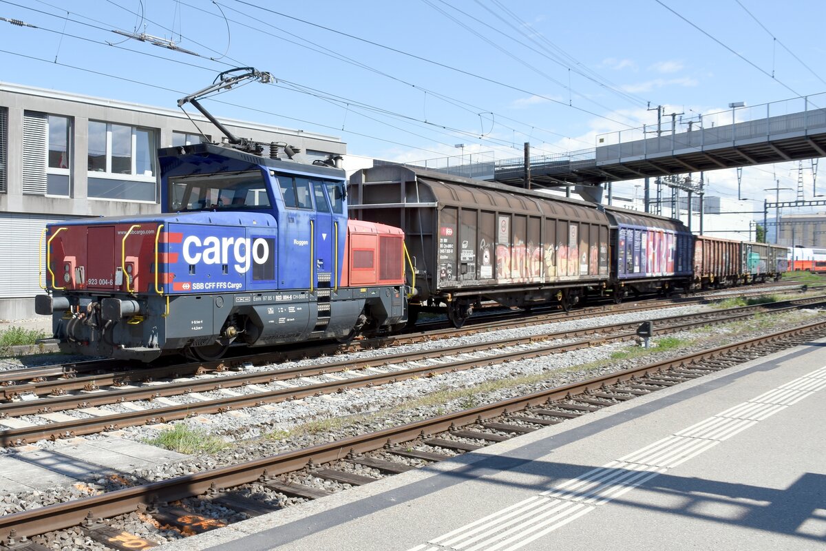ST. MARGRETHEN (Kanton St. Gallen), 23.04.2025, 923 004-6 fährt mit einigen Güterwagen am Bahnhof St. Margrethen SG vorbei; die bei Stadler Winterthur neu entwickelte zweiachsige Hybridlok vom Typ Eem 923 Hybrid basiert auf der Rangierlok Ee 922, die über einen elektrischen Hauptantrieb sowie einen ergänzenden Diesel-Hilfsantrieb für das Bedienen von Anschlussgleisen ohne Fahrdraht verfügt