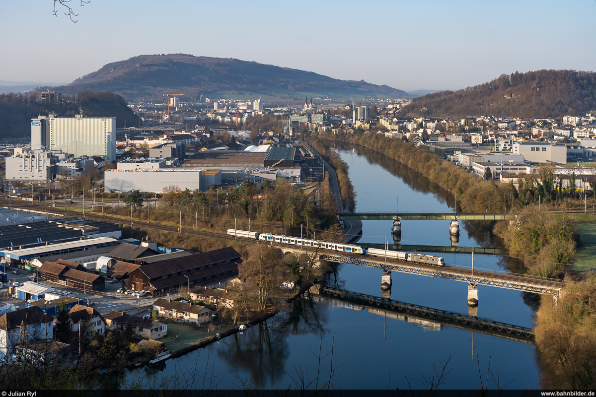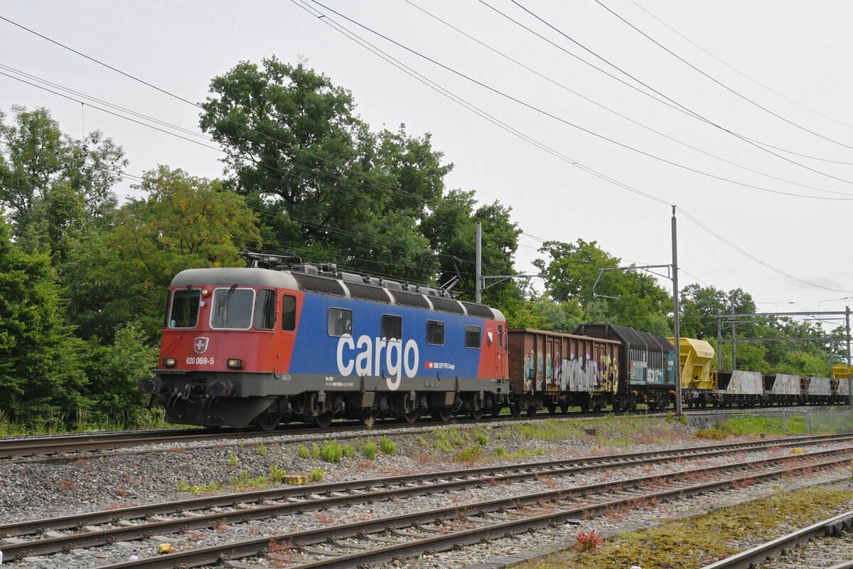 Schweizer Zucker AG, Zuckerfabrik Aarberg, Kampagne 2025: Re 620 003-4 + 27 Eaos/Eas, Zug 69417 Aarberg-Islikon, Leerwagenzug zum Abholen von Rüben in der stillstehenden Zuckerfabrik Frauenfeld, Busswil, 18. Dezember 2025.