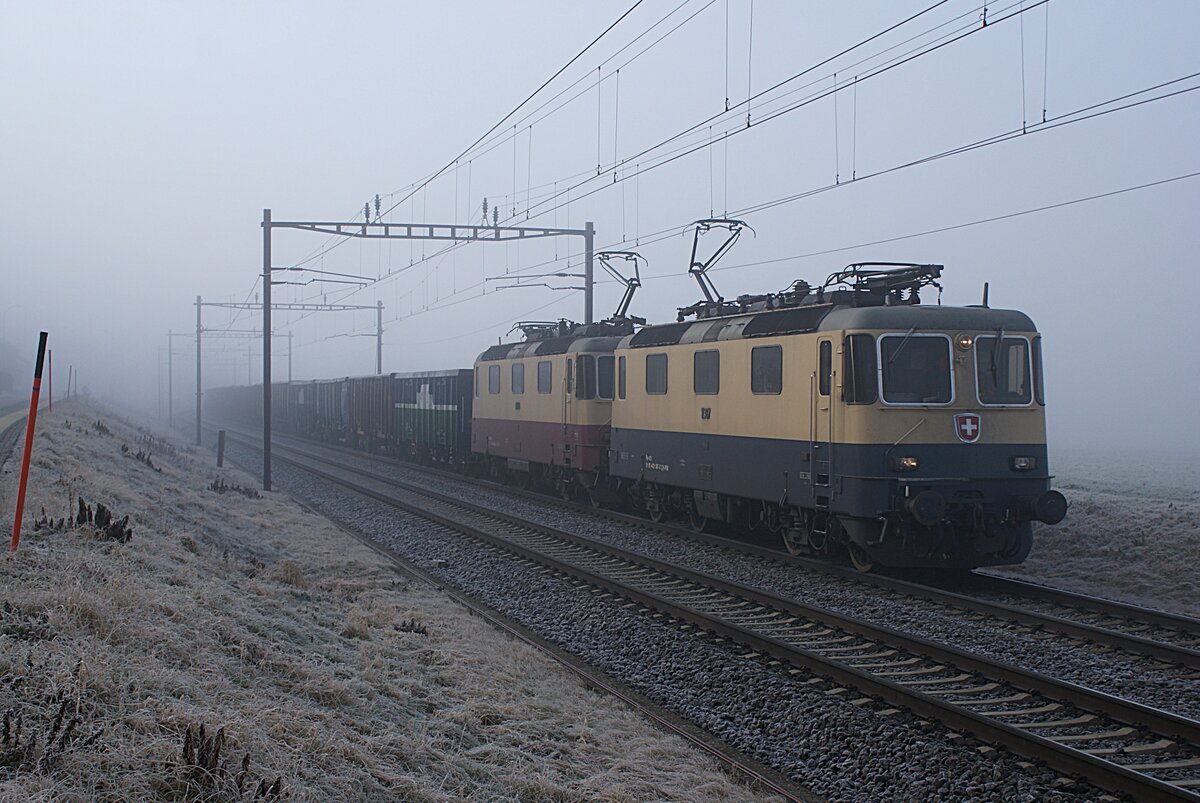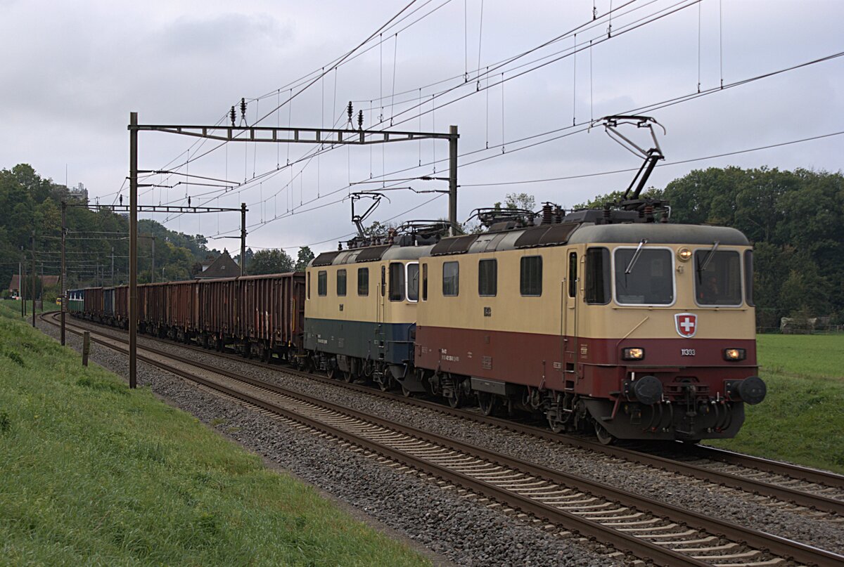 Schweizer Zucker AG, Zuckerfabrik Aarberg, Kampagne 2025: Re 4/4 II 11393 + Re 4/4 II 11387 (beide von IRSI) + 24 Eaos/Eas, Zug 67153 Chavornay-Aarberg, Aarberg, 24. Oktober 2025.
