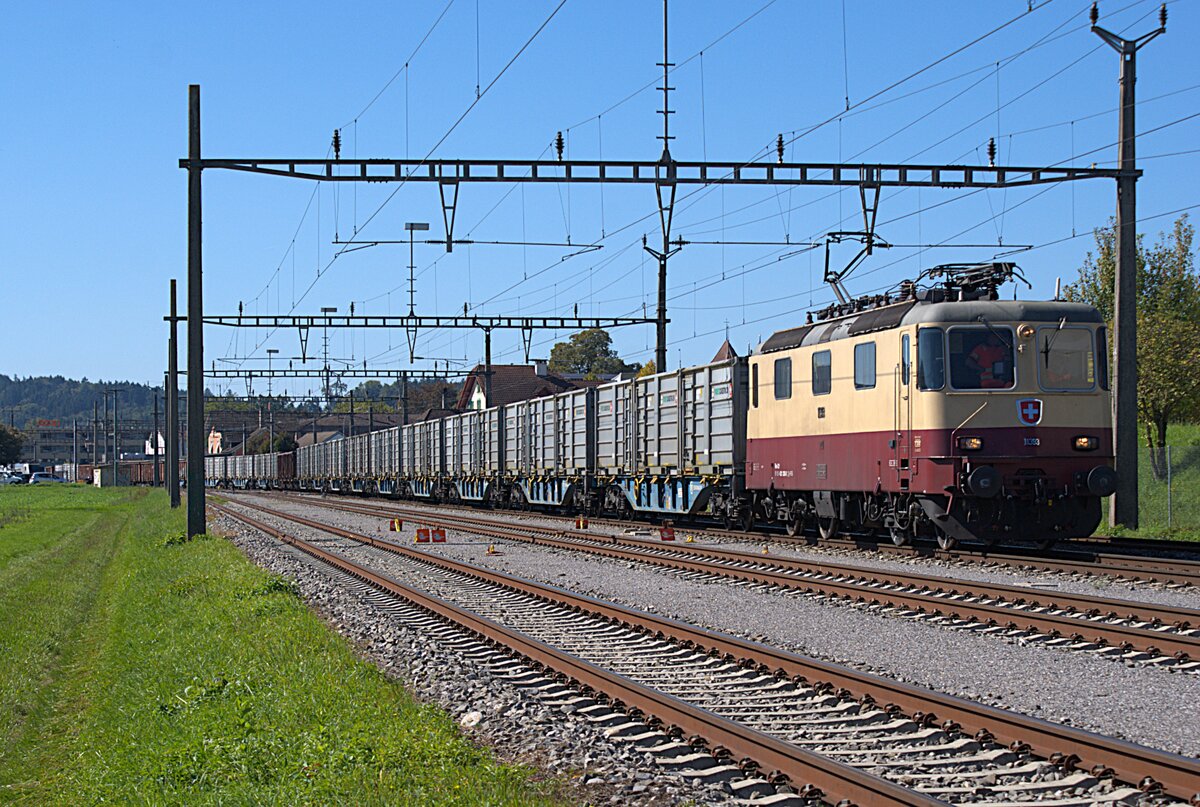 Schweizer Zucker AG, Zuckerfabrik Aarberg, Kampagne 2025: Re 4/4 II 11393 + Re 4/4 11387 (beide von IRSI) + 29 Eaos/Eas, Zug 69417 Aarberg-Islikon, Leerwagenzug zum Abholen von Rüben in der Zuckerfabrik Frauenfeld, Lyss, 14. Januar 2025. Gleis 1 (ganz links) ist gerade frei (IR 65 Bern-Biel und S3 Belp-Bern-Biel). Auf Gleis 2 wartet ein RABe 525 (vierteiliger Nina) als S35 Lyss-Kerzers. Auf Gleis 3 fährt weg IR 65 Biel-Bern, RABe 515 036 (Mutz). Auf Gleis 4 steht S36 Lyss-Büren, ein RABe 525 (dreiteiliger Nina).