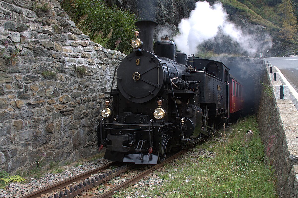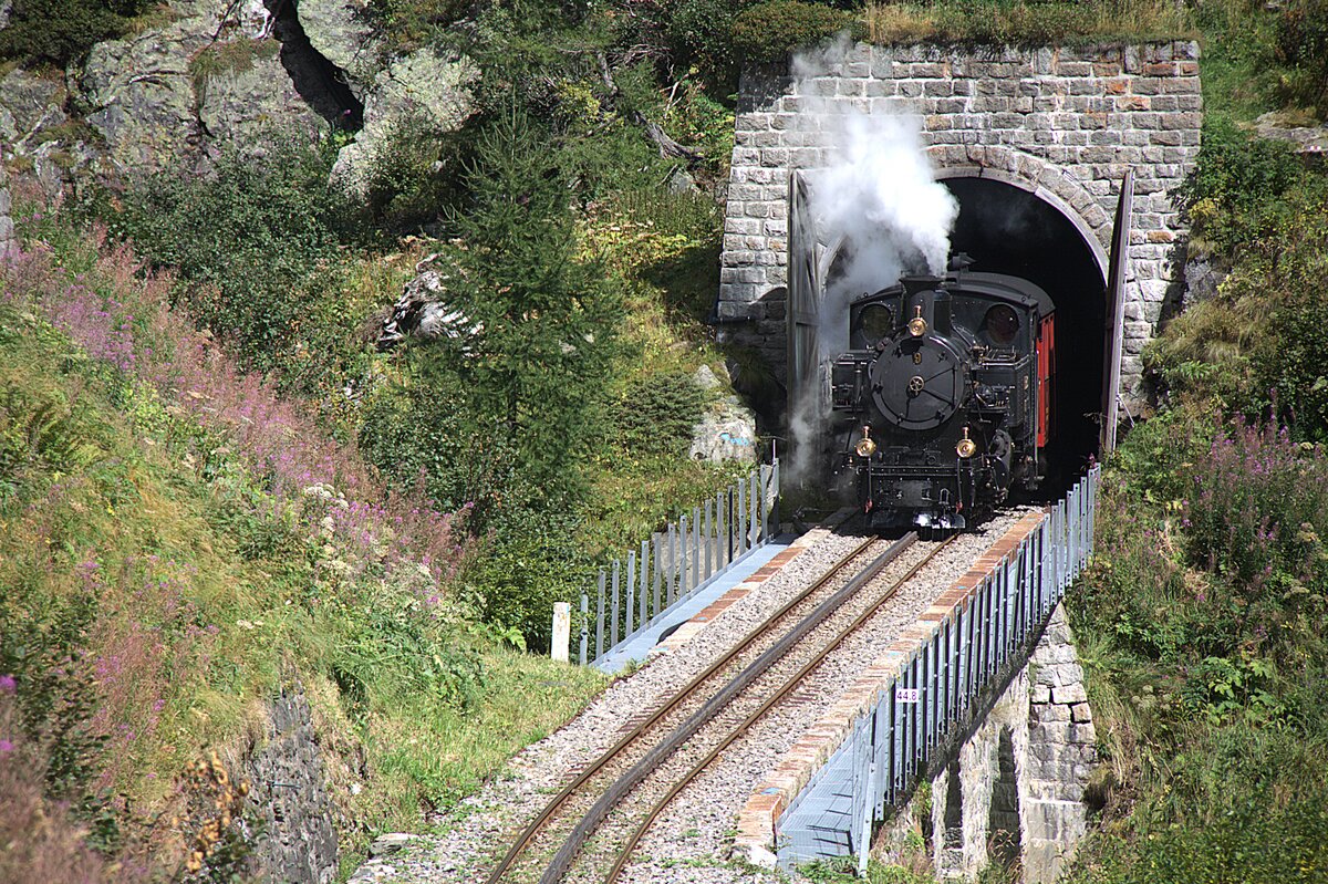 Am 06.09.2024 verlässt ein Zug der Dampfbahnfurkabergstrecke den Kreiskehrtunnel bei Gletsch und befährt die kleine Brücke über die Rohne.