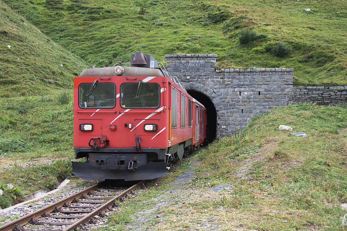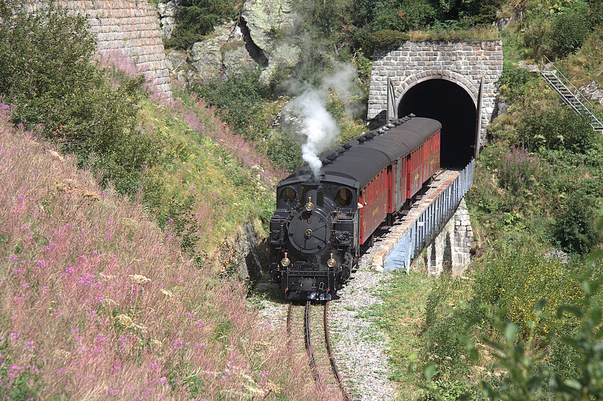 Die Lok erscheint am 06.09.2024 im Westportal des Furkascheiteltunnels bei Muttbach und fährt Richung Gletsch und Oberwald.